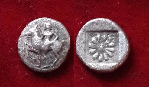 Ionia, Erythrae AR Diobol 480-450 BC. Erythros standing holding horse Rosette