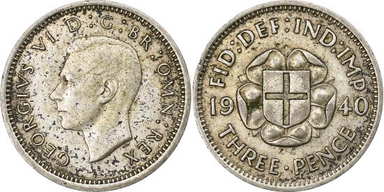 | | Great Britain, George VI, 3 Pence, 1940, Silver, , KM:848 | | | Head left, St. George shield on Tudor rose divides date, T. H. Paget | | FEATURES |