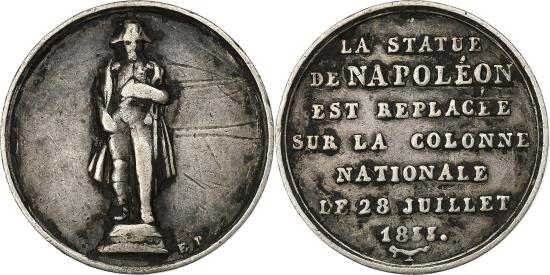 | | France, Token, Restauration de la statue de Napoléon par Louis-Philippe, 1833 | | | Napoléon's statue, NAPOLÉON LE GRAND, À LA GLOIRE DE LA FRANCE LA STATUE DE NAPOLÉON EST RÉTABLIE SUR LA COLONNE PAR LOUIS PHILIPPE 1833 | | FEATURES |