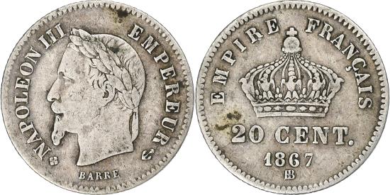 | | France, Napoleon III, 20 Centimes, Napoléon III, 1867, Strasbourg, Silver | | | Napoléon III, Laureate head left, Crown above denomination | | FEATURES |