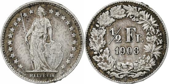 | | Switzerland, 1/2 Franc, 1908, Bern, Silver, , KM:23 | | | Standing Helvetia with lance and shield within star border, Value, date within wreath | | FEATURES |