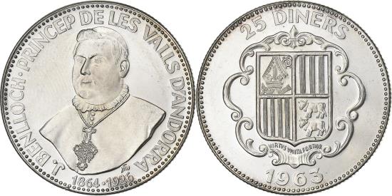 | | 25 Diners, 1963, Silver, , KM:7 | | | National arms, Bishop Benlloch of Urgel, Prev. KM#M3., 25 DINERS // 1963, J . BENLLOCH . PRINCEP DE LES VALLS D'ANDORRA // 1864 - 1926 | | FEATURES |