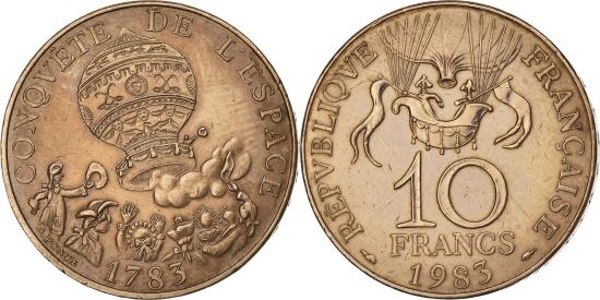 | | France, 10 Francs, La conquête, 1983, Paris, Nickel-Bronze, | | | La conquête, Denomination and date below balloon basket, Balloon, figures and date below | | FEATURES |