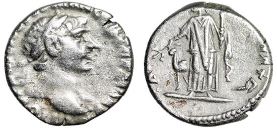 TRAJAN AR DRACHM Arabia, Bostra Mint Dated RY 16, Cos. 6 (AD 112) Obverse: Laureate head to right, drapery on left shoulder Reverse: Arabia standing facing, head to left, holding branch and bundle of cinnamon sticks(?); camel at side to left References: RPC III 4073 Size: 17mm, 2.88g Professional Numismatic Notes: Very-fine!