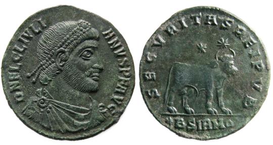 PCW-R5454-ROMAN EMPIRE, Julian II. 360-363 AD. Æ Double Maiorina (8.71 gm; 28 mm). Sirmium mint, 361-363 AD. DN FL CL IVLIANVS PF AVG, pearl-diademed, draped, cuirassed bust of Julian II right. Rev. SECVRITAS REIPVB, bull standing right, two stars above. Mintmark *ASIRM (wreath) in exergue. RIC 1065; Vagi 3358 var. Sharply struck on a nice full flan. Well centered. Choice Superb EF. Nice original find green patina. |