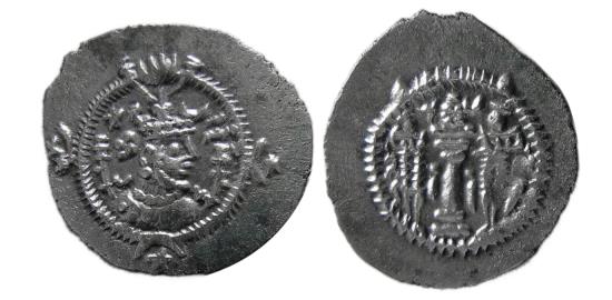 PCW-S1972-SASANIAN KINGS, Kavad I. Second reign, AD 499-531. AR Obol (0.41 gm; 12 mm). Bust right, wearing mural crown with frontal crescent, two ribbons, and korymbos set on crescent, ribbons and crescents on shoulders; star behind head, star-in-crescents in margin / Fire altar with ribbons; flanked by two attendants; star and crescent flanking flames. SNS type Ic/1a; Göbl type III/1; Paruck -; Saeedi -; Sunrise 968var. Well struck on a broad flan. Choice AU. Lightly toned. Rare. |