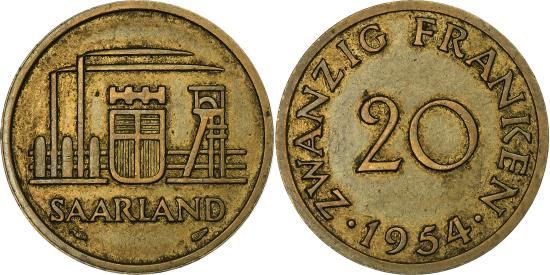 | | SAARLAND, 20 Franken, 1954, Paris, Aluminum-Bronze, , Gadoury:2, KM:2 | | | Industrial scene, arms at center, Value and date | | FEATURES |