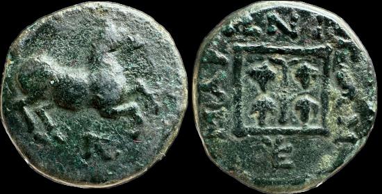 , Maroneia. c.150-100 BC. AE. Horse prancing right; monogram below / Grape vine within linear square; monogram below. Psoma, Maroneia M117; HGC 3, 1545.