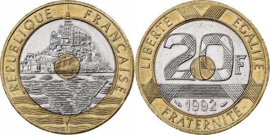 | | France, 20 Francs, Mont Saint Michel, 1992, Tri-Metallic, | | | Mont Saint Michel, Mont St. Michel, Patterned denomination above date within circle | | FEATURES |