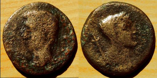 IMP AVG P P ; Bare head of Augustus left / Draped head of Astarte right, wearing stephane; scepter to left.
