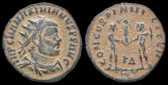obv: C IMP C M A MAXIMIANVS P F AVG, radiate, draped and cuirassed bust right