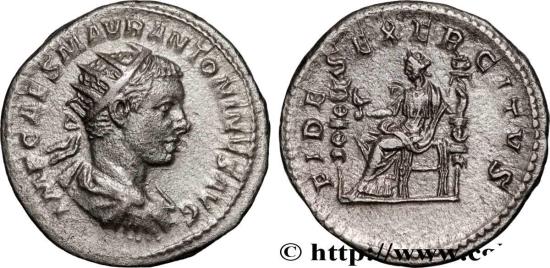 ELAGABALUS Antoninien 218 Rome silver Obverse : IMP CAES M AVR ANTONINVS AVG Buste radié et drapé à droite, vu de trois quarts en arrière (A21) Reverse : FIDE-S EXER-CITVS Fides (La Fidélité militaire) assise à gauche, les jambes croisées, tenant de la main droite étendue, un aigle et de la gauche une enseigne ; devant elle, une autre enseigne Commentary : Bel antoninien idéalement centré, à l’usure fine et régulière. Patine grise