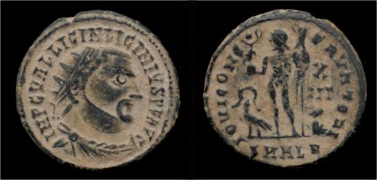 Licinius I (308-324AD) AE3- 2,8 gram- 19 mm, Alexandria mint struck 321-324AD obv: IMP C VAL LICIN LICINIVS P F AVG, radiate, draped, and cuirassed bust right rev: IOVI CONS_ERVATORI, Jupiter standing left, naked except for chlamys across left shoulder, holding Victory on globe in right hand, and left leaning on sceptre; eagle with wreath in beak at feet to left; captive on ground to right, X/II episemon in right field, SMALB in exergue RIC VII 28 |