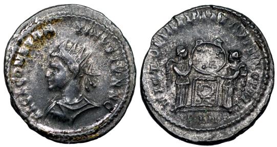 VICTORIAE LAETAE PRINC PERP; two Victories stg., facing one another, together holding shield inscribed VOT PR on altar inscribed with wreath.