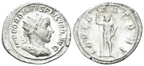 Gordian III. 238-244 AD. AR Antoninianus (4.00g, 24mm). Rome mint. Struck 241-3 AD. Obv.: IMP GORDIANVS PIVS FEL AVG, radiate, draped, and cuirassed bust right. Rev.: IOVI STATORI, Jupiter standing facing, head right, holding long scepter in right hand and thunderbolt in left. RIC 84; RSC 109. Nice VF. |