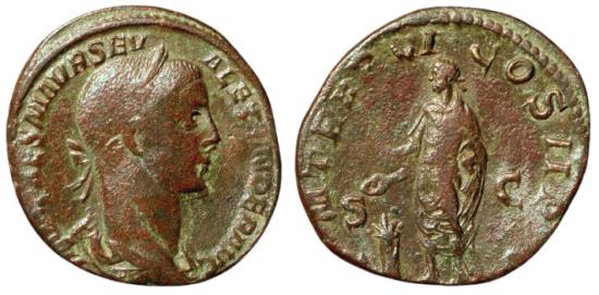 Severus Alexander AD 222-235. AE Sestertius. Rome. IMP CAES M AVR SEV ALEXANDER AVG, laureate and draped bust right / P M TR P P (sic) VI COS II P P, S C, Alexander, togate, standing left, holding patera and sacrificing over altar.