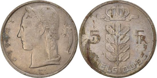 | | Belgium, 5 Francs, 5 Frank, 1974, Copper-nickel, , KM:134.1 | | | Plant divides denomination, Crown at top, legend in French, Laureate head, left, small diamonds flank date at left, symbol at right, BELGIQUE Rau | | FEATURES |