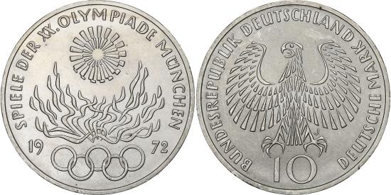 | | GERMANY - FEDERAL REPUBLIC, 10 Mark, 1972, Hambourg, Silver, , KM:135 | | | Eagle above denomination, Olympic Flame, spiral symbol above, rings divide date below | | FEATURES |