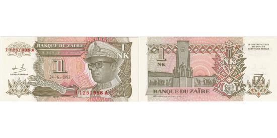 | | Zaire, 1 Nouveau Likuta, 1993-06-24, UNC(65-70) | | | Issued note., Mobutu in military dress at right, arms at lower right, leopard at lower left. Signature 9., Banque du Zaïre at left center., Violet and purple on multicolor underprint. | | FEATURES |