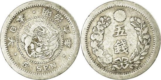 | | Coin, Japan, Mutsuhito, 5 Sen, 1873, , Silver, KM:22 | | | Dragon within beaded circle with legends around border, Chrysanthemum divides wreath, value within, Year 6, Varieties exist. | | FEATURES |