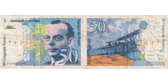 | | France, 50 Francs, St Exupéry, P050871094, VF(30-35) | | | Signature as c. 1997, 1999., Drawing of le Petit Prince at left. Old airplane at top left, topographical map of Africa at center, Antoine de Saint-Exupéry at right., Breguet XIV biplane. Name as Exupéry, new law clause. | | FEATURES |