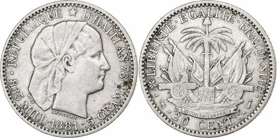 | | Haiti, 20 Centimes, 1881, Paris, Silver, , KM:45 | | | Tiara head right, National arms, REPUBLIQUE * D'HAITI AN 78 / · 835 MILL·1881·5 GRAM ·., *LIBERTÉ·ÉGALITÉ·FRATERNITÉ· / ·20 CENTES·. | | FEATURES |