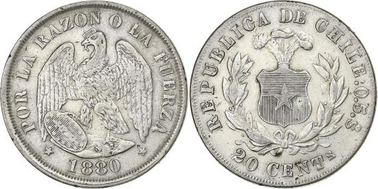 | | Chile, 20 Centavos, 1880, Santiago, Silver, , KM:138.2 | | | National emblem of Chile within wreath, Condor, Law of June 14, 1879 authorized change of silver alloy from 0.9 to 0.5 silver., REPUBLICA DE CHILE 0.5. SO // 20 CENTS ., POR LA RAZON O LA FUERZA // 1880. | | FEATURES |
