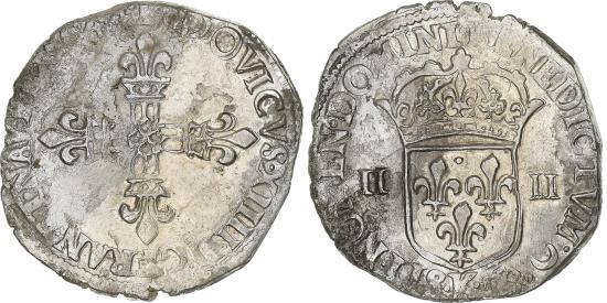 | | France, Louis XIV, 1/4 Ecu, frappé au marteau, 1644, Bordeaux, Silver | | | Cross with stick and fleur-de-lys., Crowned shield of France accosted by II II., LVDOVICVS XIIII D G FRAN ET NAV REX 1644, SIT NOMEN DOMINI BENEDICTVM / K // II II | | FEATURES |