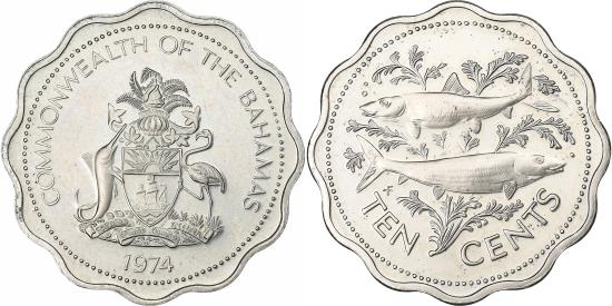 | | Bahamas, Elizabeth II, 5 Cents, 1974, Franklin Mint, Copper-nickel, | | | National arms above date, Pineapple above garland divides value at top, COMMONWEALTH OF THE BAHAMAS | | FEATURES |