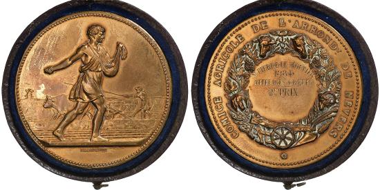 | | France, Medal, Comice Agricole de l'Arrondissement de Nevers, 1884, Bronze | | | Medal sold with its original case. The case is very damaged, the cover is slightly removed at the top, but with 5 holes underneath., St-PIERRE-LE-MOUTIER / 1884 / ATTELAGES DE BŒUFS / 2è PRIX | | FEATURES |