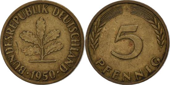 | | GERMANY - FEDERAL REPUBLIC, 5 Pfennig, 1950, Hambourg, Brass Clad Steel | | | Five oak leaves, date below, Denomination, BUNDESREPUBLIK DEUTSCHLAND | | FEATURES |
