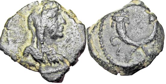 Trans Jordan , Decapolis. Petra. Pseudo-autonomous issues. Early 2nd century AD. Æ (12mm, 1.90 g, 6h). Veiled and turreted head of Tyche right / Crossed cornucopias. Spijkerman 1 var. (monogram on rev.); SNG ANS 1359. VF,
