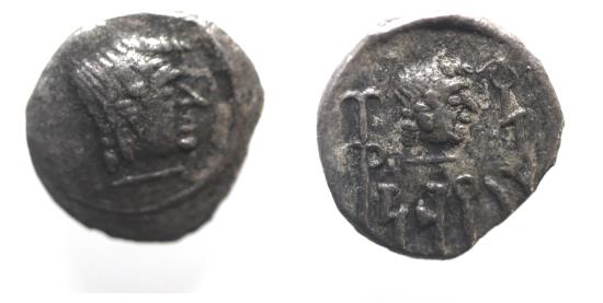 South Arabia. Himyarites. Uncertain ruler (c. AD 100-120). AR fraction (8mm, 0.21g). Raydan mint. Male head r. / Small male head r.; to l., ’sceptre’ symbol; below, RYDN in South Arabian script. Huth 433; Munro-Hay 3.89aiv.