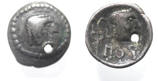 South Arabia. Himyarites. Uncertain ruler (c. AD 175-215). AR fraction (9mm, 0.38g). Raydan mint. Male head r. / Small male head r.; to l., ’sceptre’ symbol; below, Y’B in South Arabian script. Munro-Hay 3.25iii.