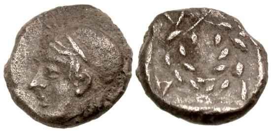 Helmeted head of Athena left / EΛAI, laurel wreath within incuse square.