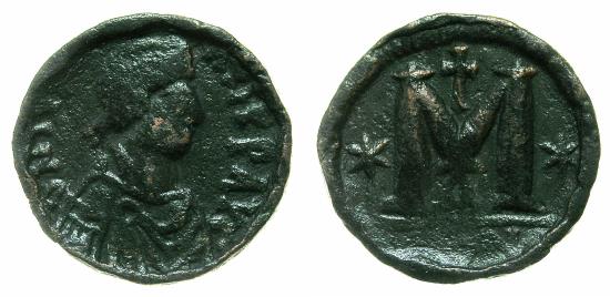 BYZANTINE EMPIRE.Justin I AD 518-527.AE.Follis.Mint of Constantinople.( 16.80g, 28.3mm, 6h) DN IVST - INVS PP AVG, diademed bust of Justin I right. Reverse.Uncial letter M, star either side, between limbs officina letter A above cross, in exergue mint signature (CO)N. Ref: Sear 62. Better than very fine, edge neatly hammered. The edge of the coin is hammered in such a manner that it resembles Roman issues from the 4th-5th cent AD that are sometime referenced as ' proto contorniates'. Coin not photogenic, more pleasing to the eye in hand. |