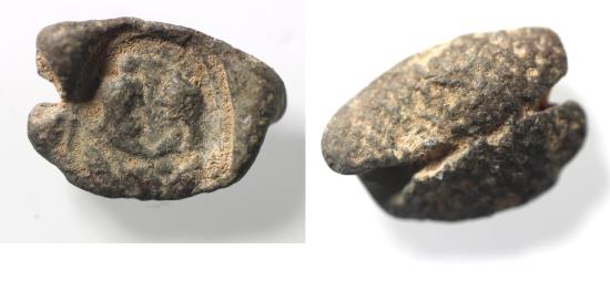 Roman Egypt. 2nd-3rd century AD. Lead seal impression (18 x 13 mm). Confronted busts of Serapis r., wearing kalathos, and Isis l., wearing basileion; below, winged scarab.
