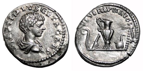 Obverse: P SEPTIMIVS GETA CAES. Bareheaded and draped bust right. Reverse: SEVERI PII AVG FIL. Emblems of the pontificate: lituus, secespita, guttus, simpulum, aspergillum. Very nice exemplar of this scarce and interesting issue, in VF+/EF- condition, conserving complete details on both sides and very bold reliefs checkable at photo. RIC 107 variant. Laodicea ad Mare mint, AD 202. 2,9 g - 19 mm -------------------------------------------------------------------------------------------------- Visit our site about Numismatics and Archaeology: aeternitas-numismatics.com |