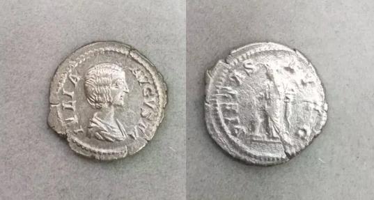 Julia Domna. AR Denarius Augusta, AD 193-217. Rome, under Septimius Severus and Caracalla, ca. AD 200-207. IVLIA AVGVSTA, draped bust of Julia Domna right. Reverse: PIETAS AVGG, Pietas standing facing, head left, dropping incense on lighted altar at feet to left, and holding box of perfumes. RIC 572; BMC 62-7; RSC 150 2.86 grams, VF |