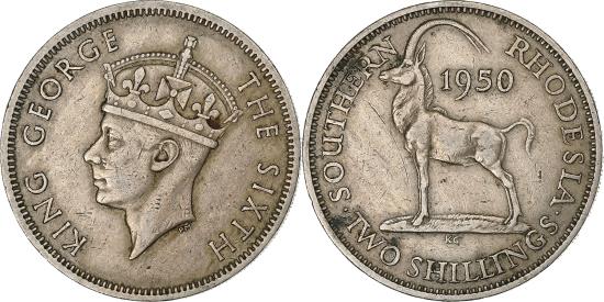 | | Southern Rhodesia, George VI, 2 Shillings, 1950, Copper-nickel, , KM:23 | | | Crowned head left, Sable antelope, Percy Metcalfe | | FEATURES |