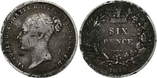 | | Great Britain, Victoria, 6 Pence, 1842, Silver, , KM:733.1 | | | Head left, Without die number, Dav. #6444., CHRISTIANUS ++ D: G: EL. EP. MIND: DUX. B. ET. L | | FEATURES |
