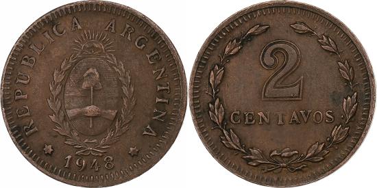 | | Argentina, 2 Centavos, 1948, Copper, , KM:38a | | | Argentine arms, Value within wreath, Cruder diework. Prev. KM#13a. | | FEATURES |