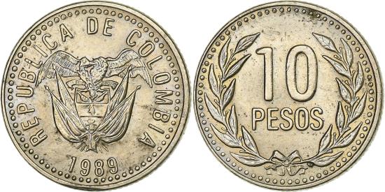 | | Colombia, 10 Pesos, 1989, Zinc Copper Nickel, , KM:281.1 | | | Flagged arms, date below, Denomination within wreath, wide 10 (5mm) - wreath nearly touches beads in rim, M1, thin planchet | | FEATURES |