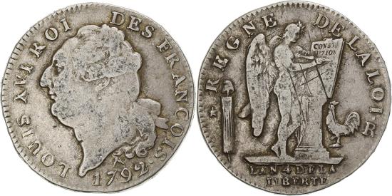 | | France, Louis XVI, Écu de 6 livres François, 1792, Orléans, Silver | | | Head of Louis XVI, hair tied with a ribbon to the left, date below., Winged Genius standing right, inscribing the Constitution on a tablet on a pedestal, fasce surmounted by a Phrygian cap to the left and rooster to the right, facing left; Revolutionary date below. | | FEATURES |