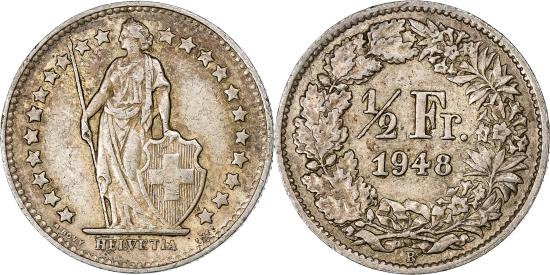 | | Switzerland, 1/2 Franc, Helvetia, 1948, Bern, Silver, , KM:23 | | | FEATURES |