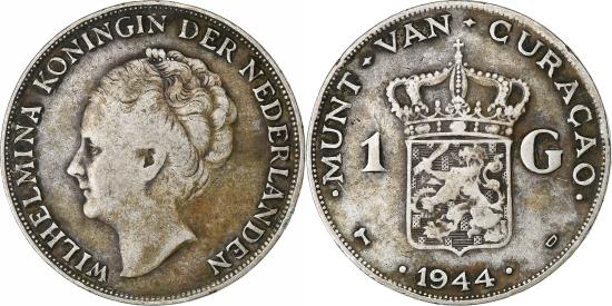 | | Curaçao, Wilhelmina I, Gulden, 1944, Silver, , KM:161.2 | | | Head left, Crowned arms | | FEATURES |
