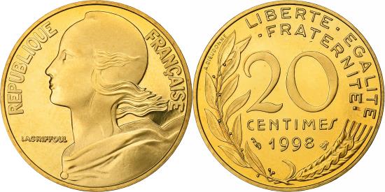 | France, 20 Centimes, Marianne, 1998, MDP, Proof, Bronze-Aluminium, |