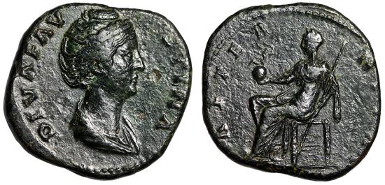 DIVA FAUSTINA I AE SESTERTIUS Rome Mint Under Antoninus Pius, A.D. 141-146 Obverse: DIVA FAVSTINA, draped bust of Diva Faustina I right Reverse: AETERN-I-TA-S, S C across field, Aeternitas seated left, holding globe surmounted by phoenix and scepter References: RIC 1103a Size: 32mm, 22.65g Professional Numismatic Notes: Very-fine with a thick dark-green patina!