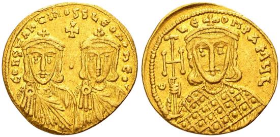 Constantinople, ca. 757-775 AD. AU solidus, 4.32 gr., 20.7 mm. Obv: COҺSTAҺTIҺOS S LЄOҺ O ҺЄOS; crowned facing busts of Constantine V and Leo IV, each wearing chlamys; above: cross, between: ·. Rev: C LЄOҺ P A MЧL; crowned bust of Leo III facing, with loros and cross potent on base. Ref: DOC 2d.3; Sear 1551. Extremely fine. |