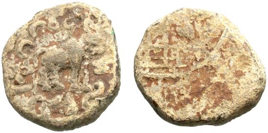 Satavahana (Andhra) empire Gautamiputra Satakarni, c. 30-70 AD PB coin (18.5 mm, 5.59 g) Nevasa-Paithan type Obverse: Humped bull standing right, with Brahmi legend Rajno Gotamiputasa Siri Satakanisa around Reverse: Tree-in-railing with broad leaves; nandipada and swastikas around Ref: Pieper This ruler is very difficult to find in lead. Very Rare. |